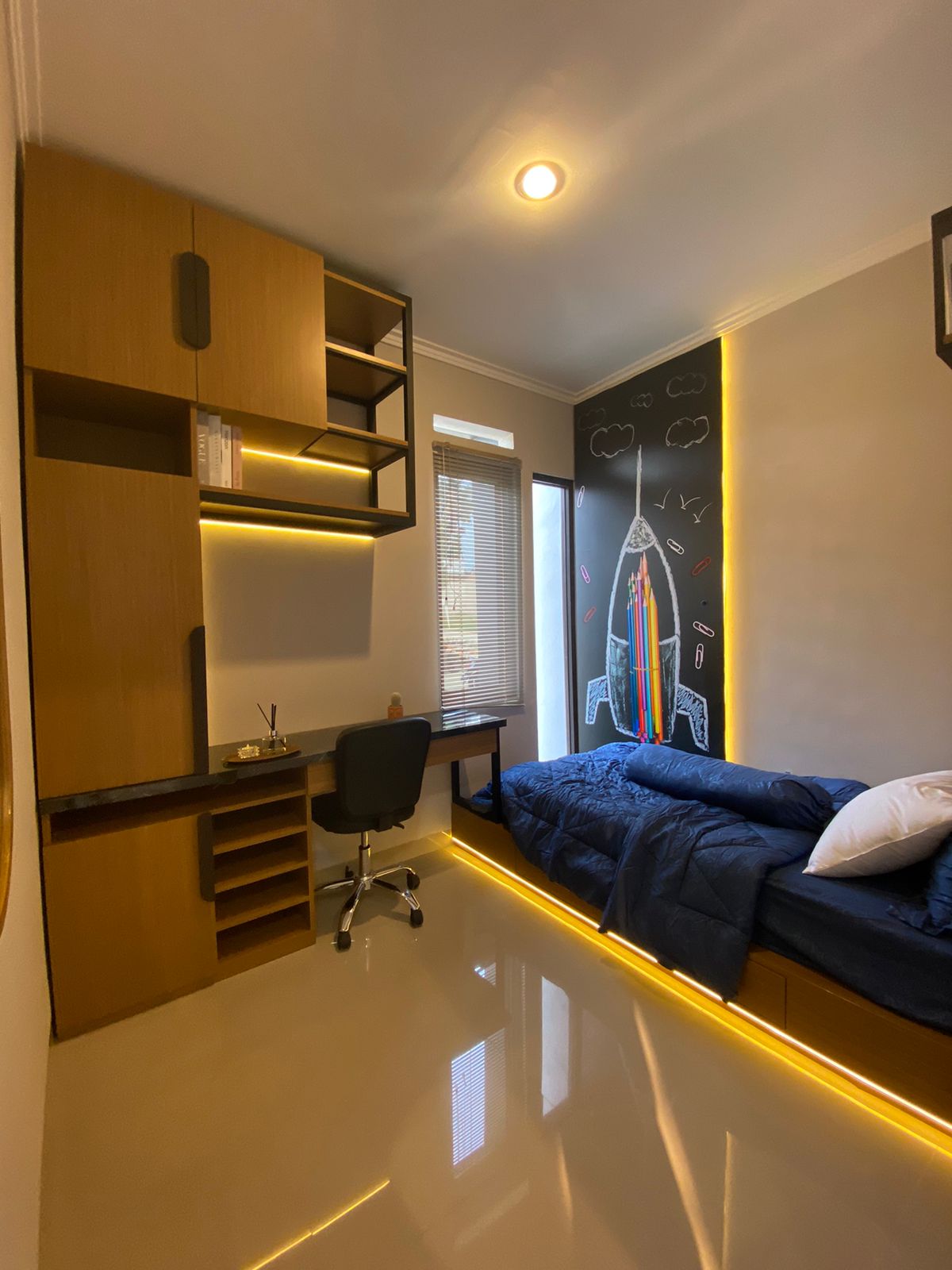 - Lantai: Menggunakan Homogenius Tile ukuran 60 x 60 untuk tampilan yang elegan dan mudah perawatan.